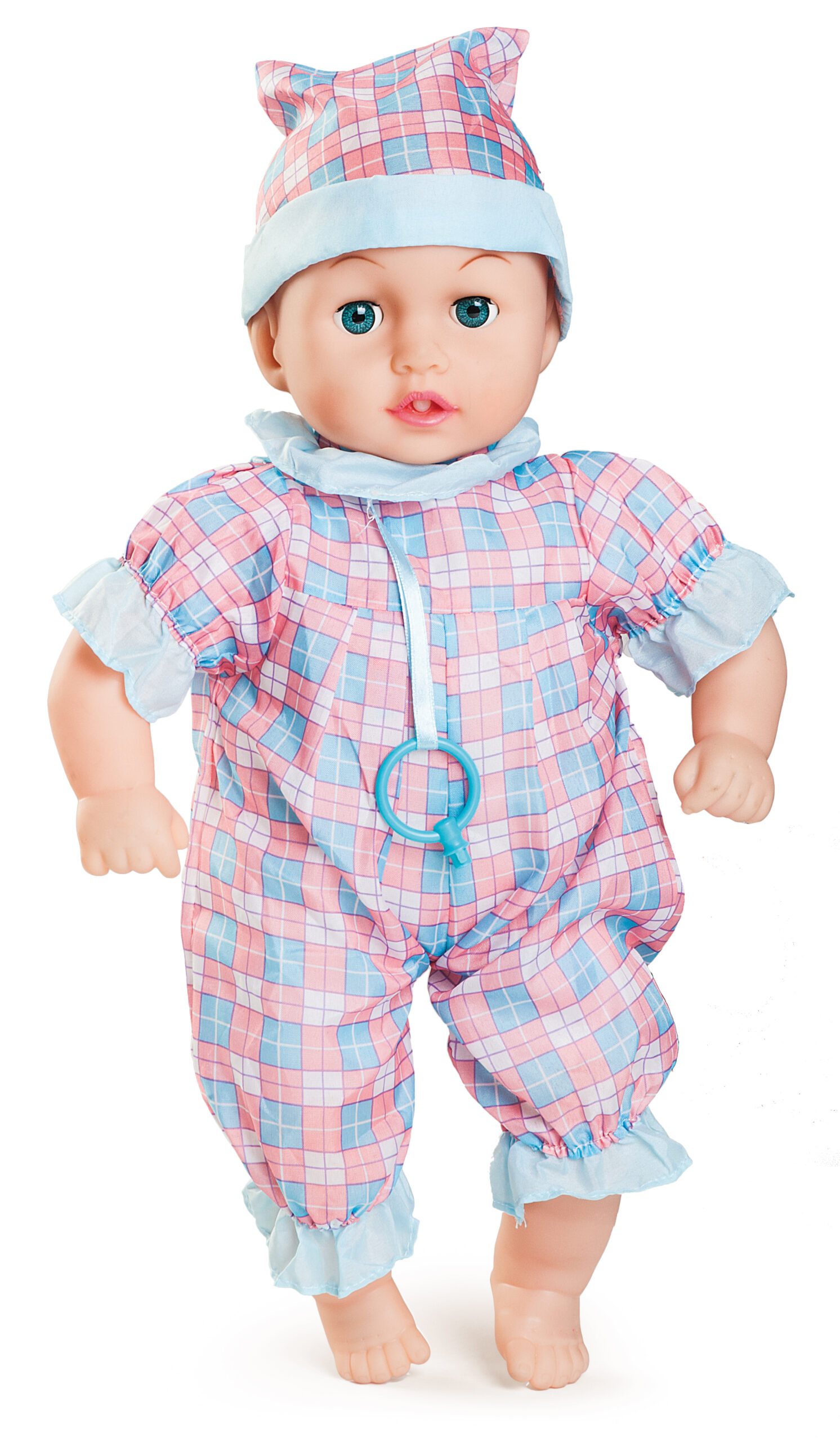 A soft talking baby doll with a dummy.