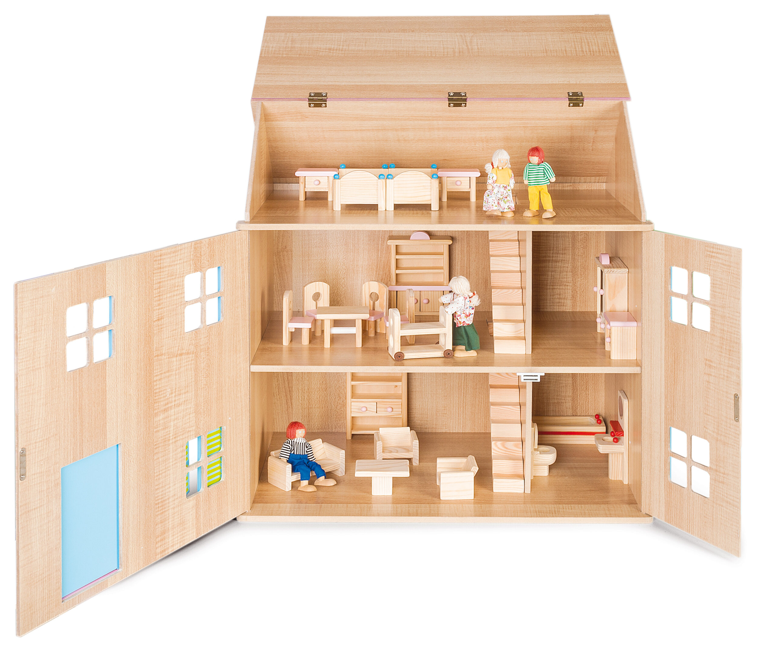 A large painted doll house with multiple rooms and removable roof for easy access. The house has openable doors and shutters.