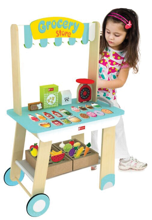 Wooden Grocery Store features fresh vegetables, fruit, milk,and handmade cookies. Buying or selling, it is all fun.