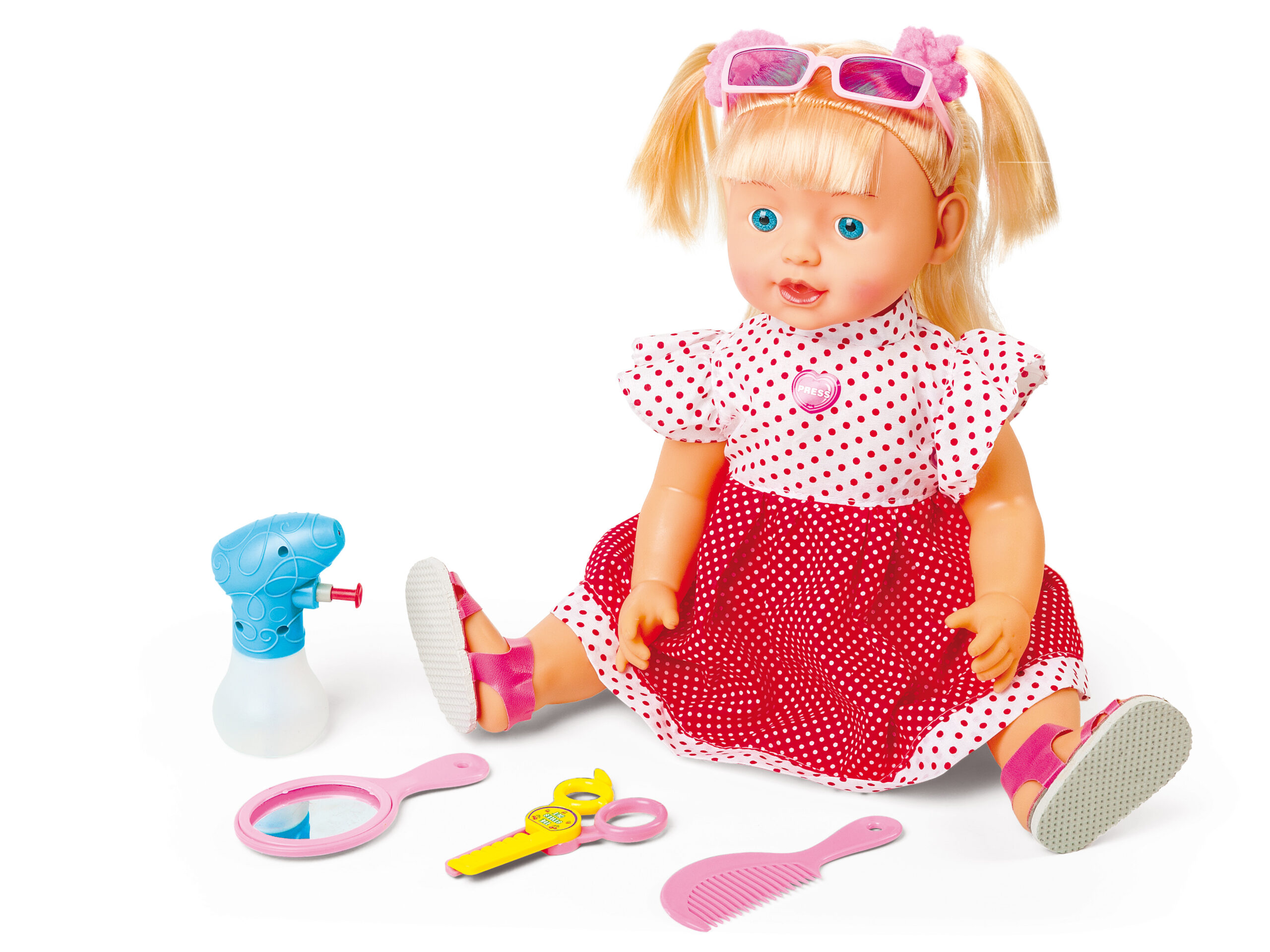 A doll with long hair and hairdressing accessories: sandals, comb, mirror, hairpins, scissors and water spray sprinkler. Pressing the button starts Milenka babbling and laughing.