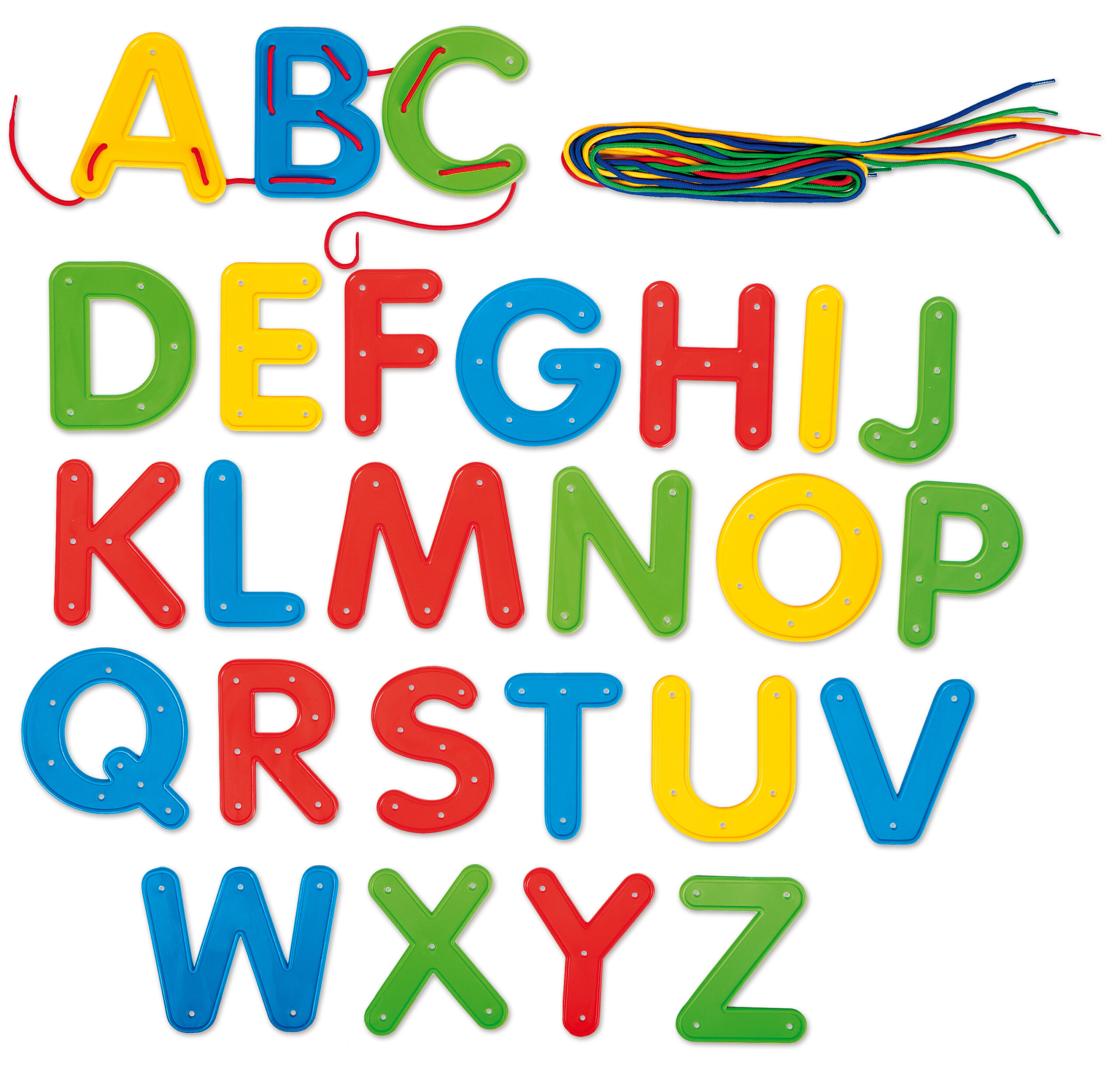 Thread letters onto coloured strings to make words! A great toy to develop motor skills and literacy. 26 coloured upper and lower case letters and 8 coloured strings, ca. 15 cm